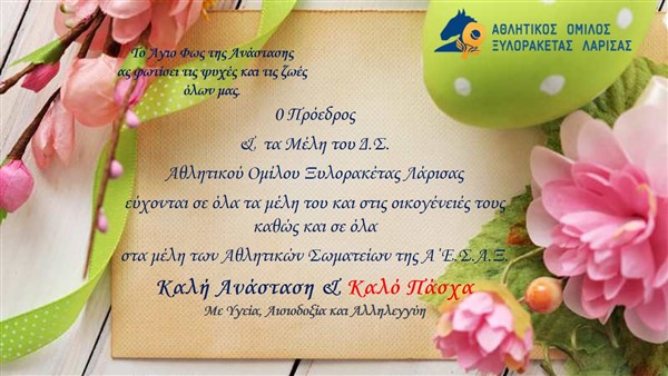 Ο Πρόεδρος και το Διοικητικό Συμβούλιο του Αθλητικού Ομίλου Ξυλορακέτας Λάρισας (Α.Ο.Ξ. Λάρισας), σας εύχονται η Ανάσταση του Κυρίου να...