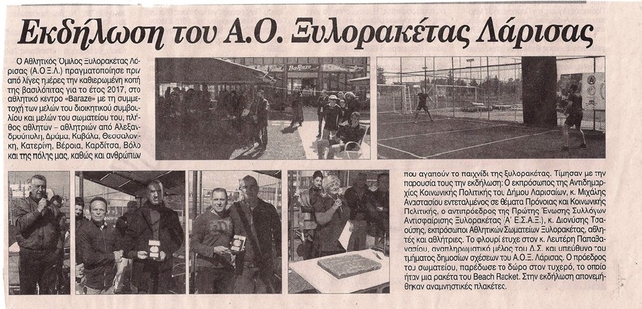 πίτας που πραγματοποιήθηκε στις 12 Μαρτίου 2017, στο αθλητικό κέντρο ‘’BARAZE’’, από τον Α.Ο. Ξυλορακέτας Λάρισας.