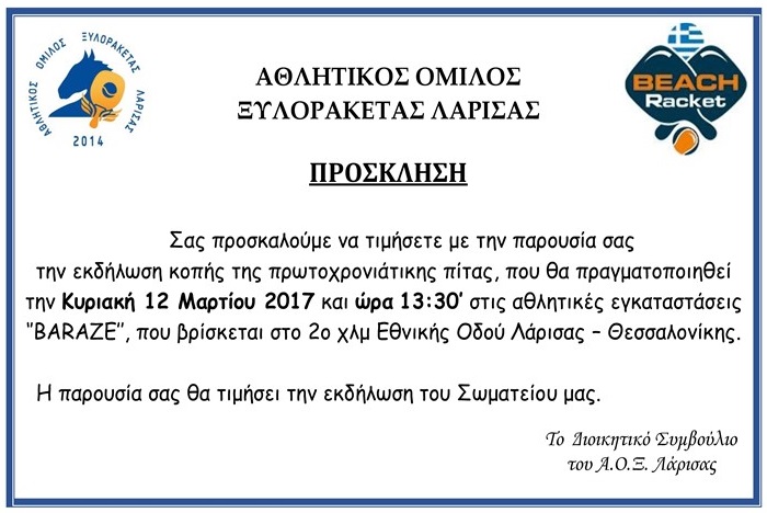 Το Διοικητικό Συμβούλιο του Αθλητικού Σωματείου ΑΘΛΗΤΙΚΟΣ ΟΜΙΛΟΣ ΞΥΛΟΡΑΚΕΤΑΣ ΛΑΡΙΣΑΣ (Α.Ο.Ξ. ΛΑΡΙΣΑΣ), προσκαλεί τα μέλη του με τις οικογένειές τους και τους φίλους τους, καθώς και φίλους μας αθλητικών σωματείων ξυλορακέτας, στην κοπή της πρωτοχρονιάτικης